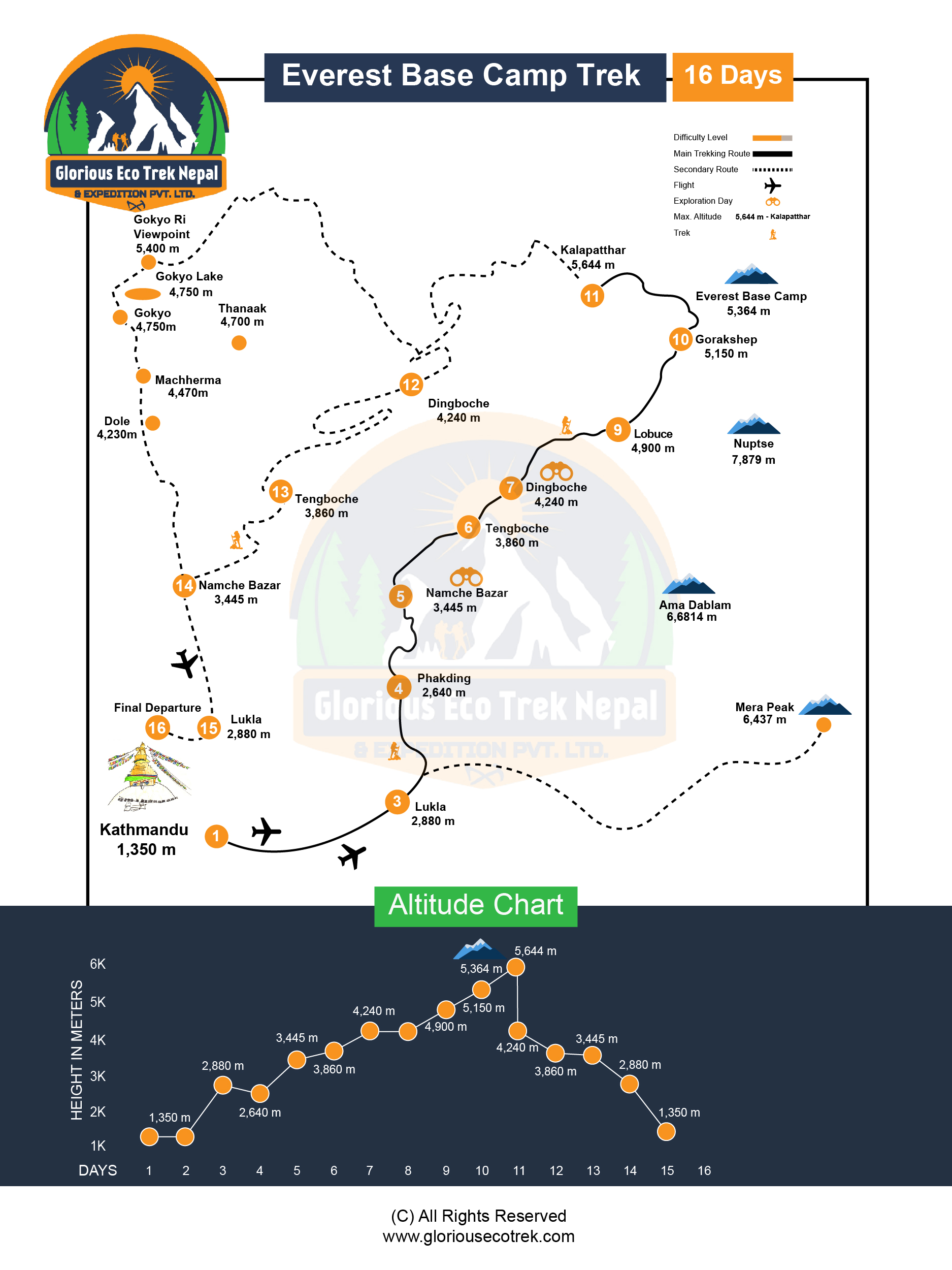This 15-day package is moderately challenging, with daily trekking hours ranging from 5 to 7 hours. Our itinerary includes acclimatization days in Namche Bazaar and Dingboche to help your body adjust to high altitudes.