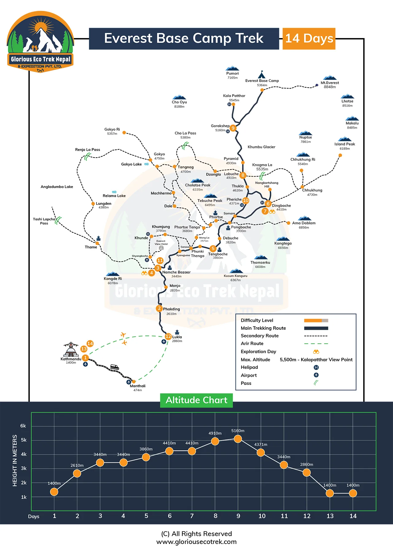 The standard Everest Base Camp Trek offered by Glorious Eco Trek Nepal takes 14 days, which includes arrival, trekking days, acclimatization stops, and return.